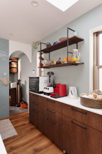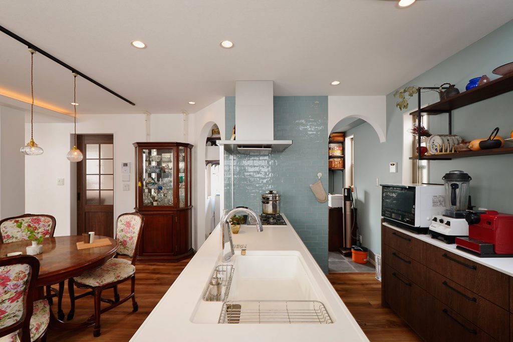 アクセントタイルやクロスの一部に使用したブルーと、床や家具の木目のコントラストが美しい仕上がりになりました。