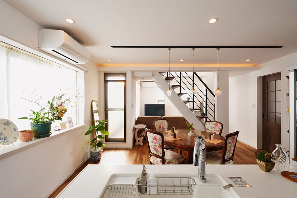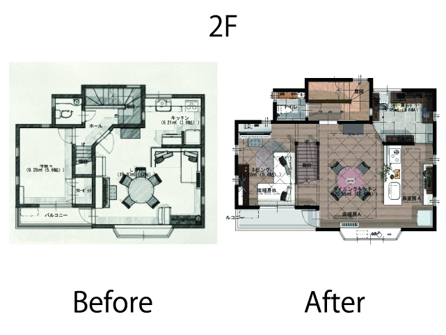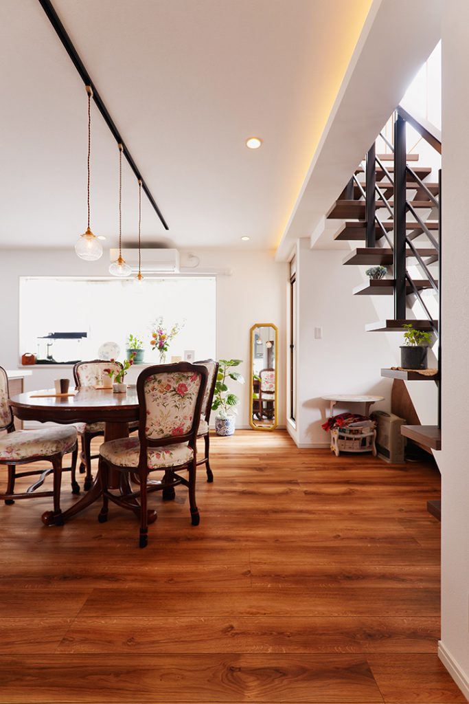 2Fは、3Fへ続く階段を挟んでダイニングと洋室がそれぞれ独立していましたが、階段をスケルトンにし、ダイニングと洋室を繋げることで広々としたLDKを実現しました。