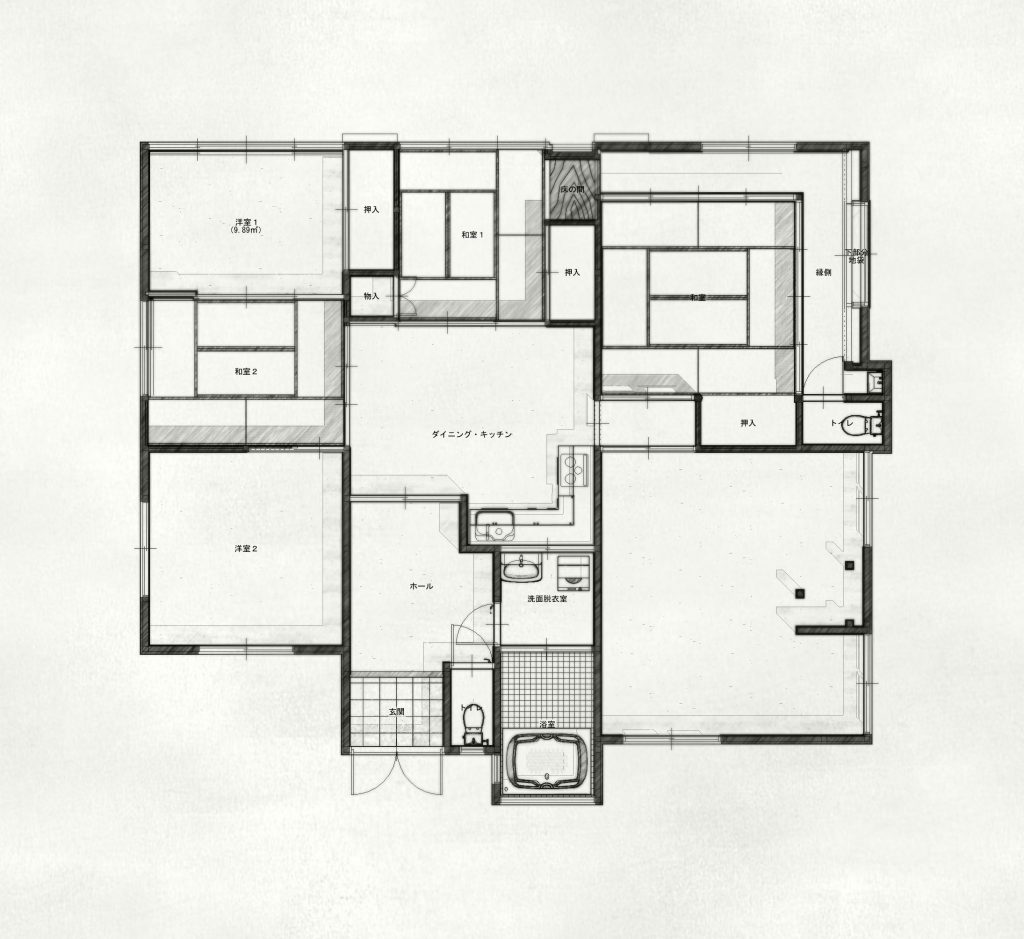 トイレ、洗面、キッチン、リビング、浴室、ダイニング、寝室、廊下
