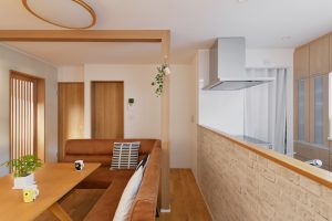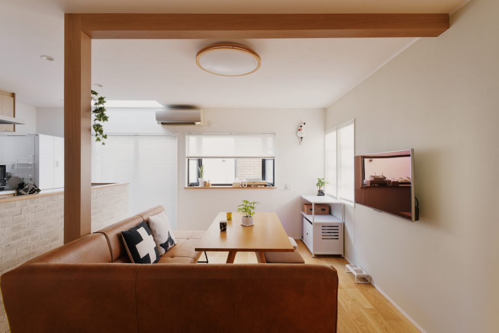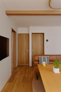 デザイン面:耐震上取れなかった梁と柱は木目のクロスを貼ってお部屋のワンポイントに