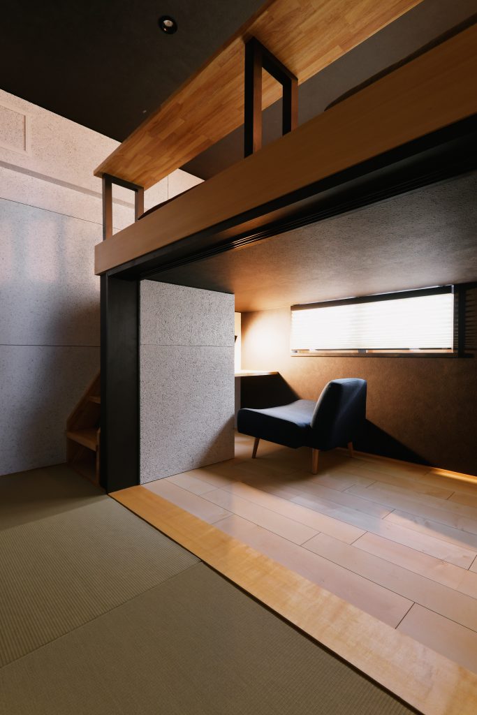 印象的な和室は、限られた面積の中で空間を有効に使うため、スキップフロアをご提案。既存窓を活かしてフロアの高さを設計。上は足を垂らして座れるカフェスペースに。水場も設けてコーヒーと映画鑑賞が楽しめます。下は奥様のワークスペース兼収納。将来は子供部屋としても使用できるように畳敷としました。
