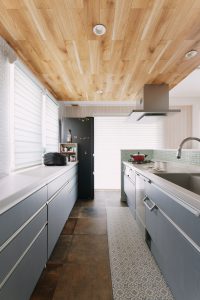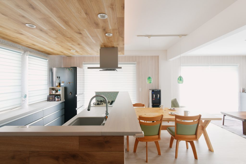 印象的なキッチンはダクトを隠すための梁(段差)を隠すために意匠としてアクセントの木目を入れ、キッチンのカウンター下にも木目アクセント。水に強いフロアタイルを採用しました。