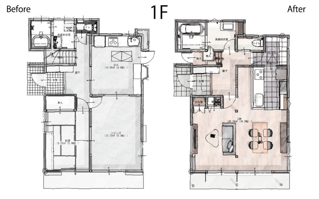 トイレ、キッチン、洗面、浴室、リビング、ダイニング、寝室、廊下、屋根、外壁、造作家具
