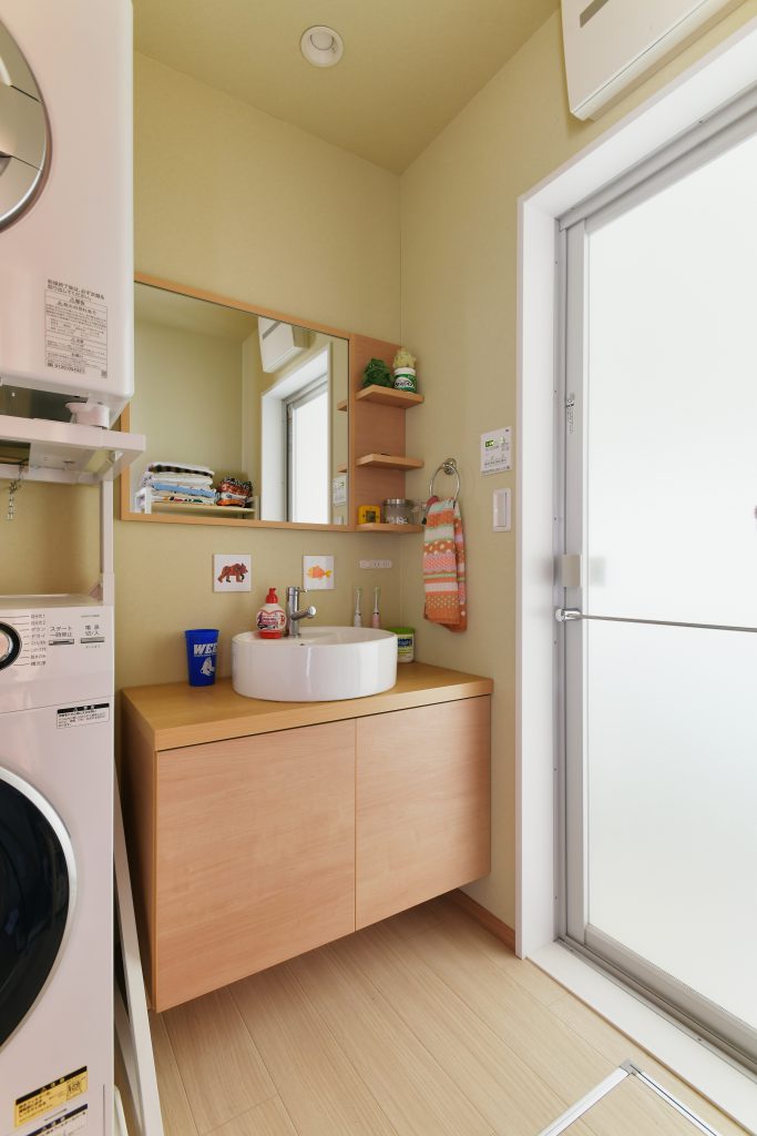 脱衣室、洗濯置き場:お風呂の位置をキッチン側に移動することで、脱衣スペースを広く確保できた