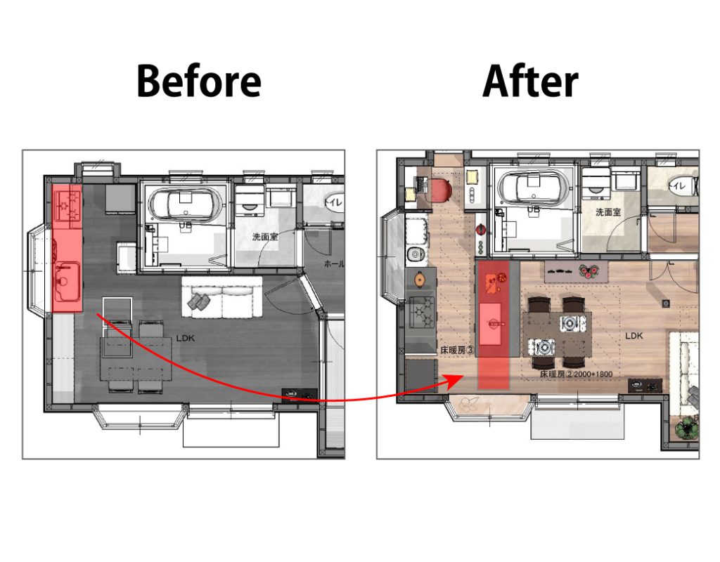 壁付けのI型キッチンを対面化するにあたり、横幅が大きく取れなくなることがネックでした。