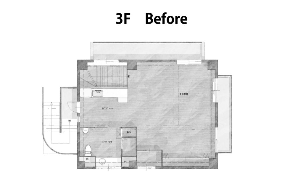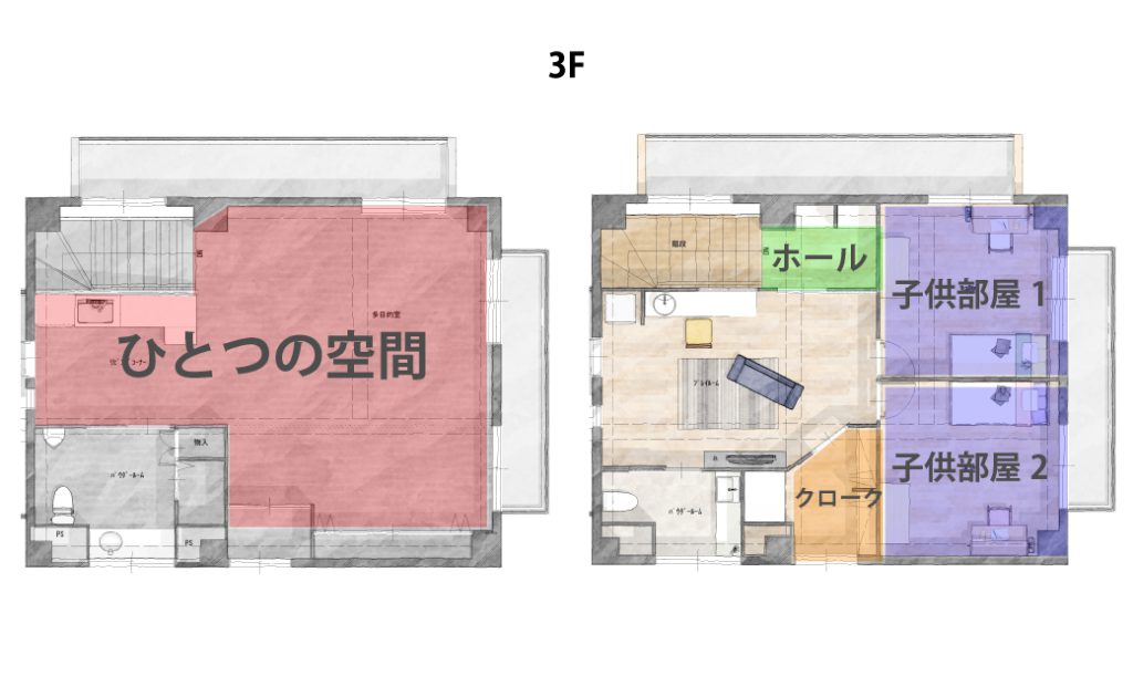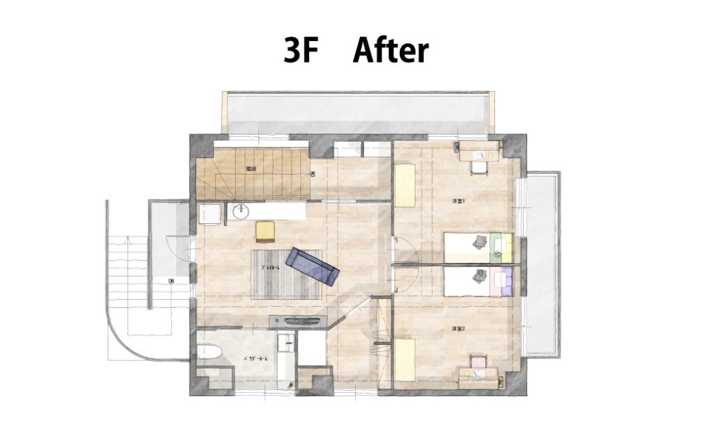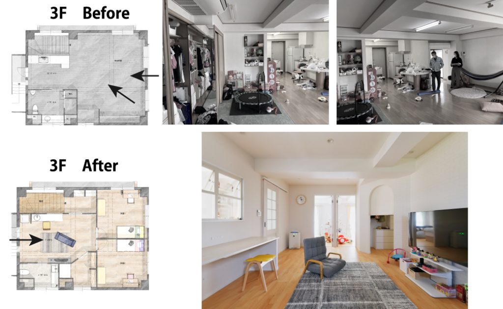 3Fは一続きの開放的な空間でしたが、使い勝手が悪く、お子様の遊び場やゴルフのパターの練習場と化していました。改めて使い道を考え直し、部屋を用途に合わせて仕分けました。