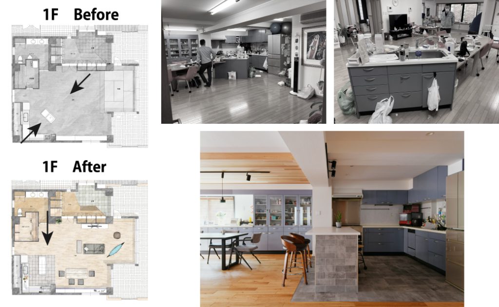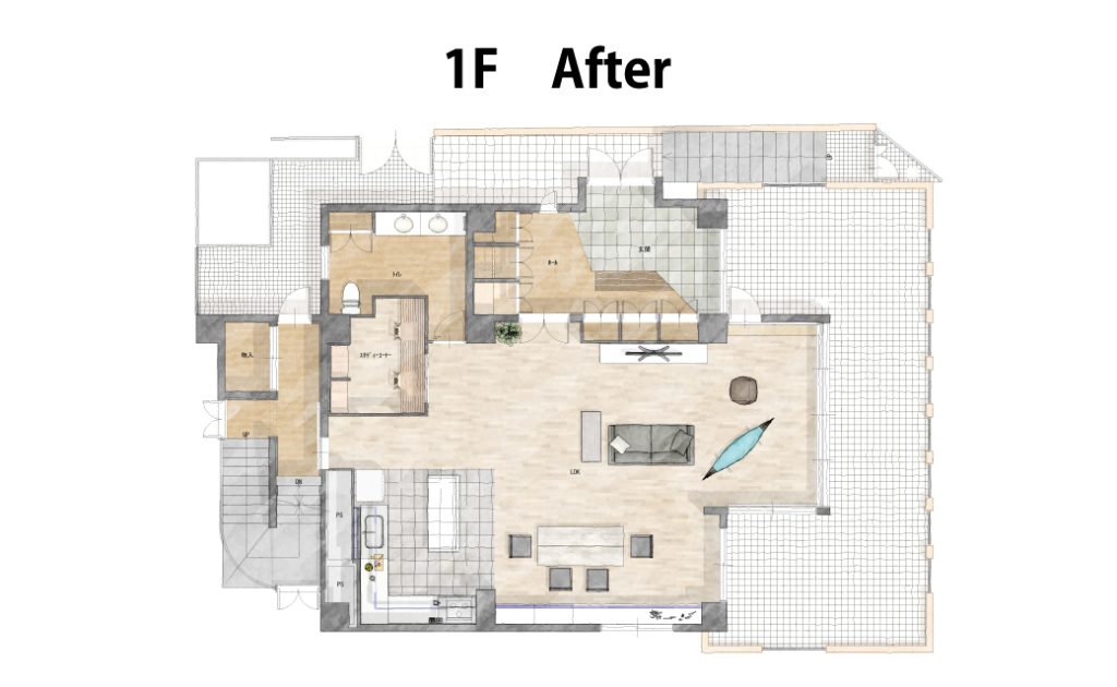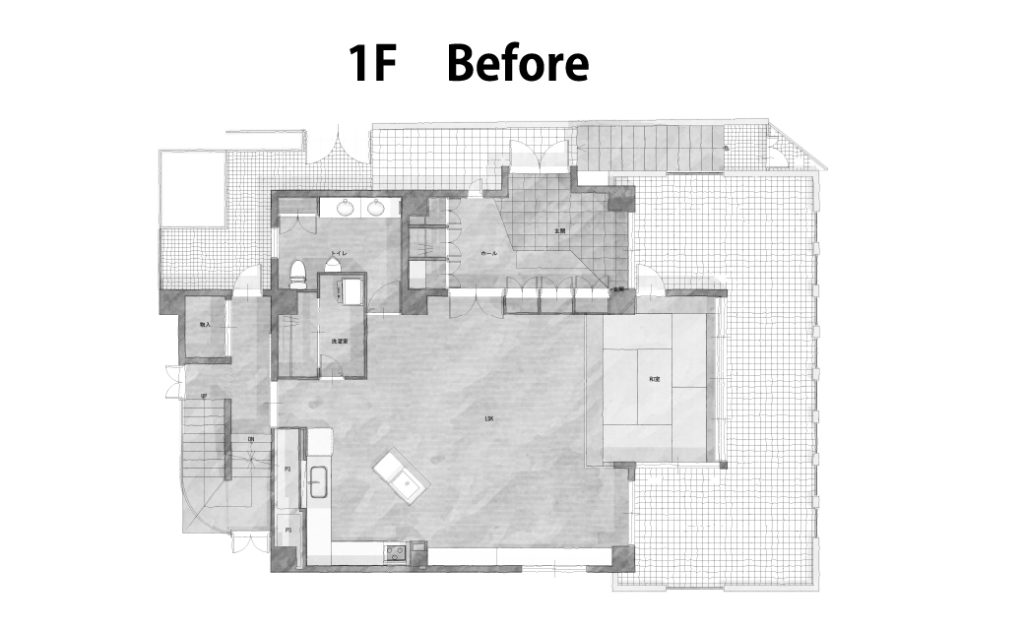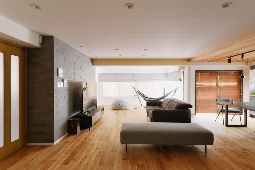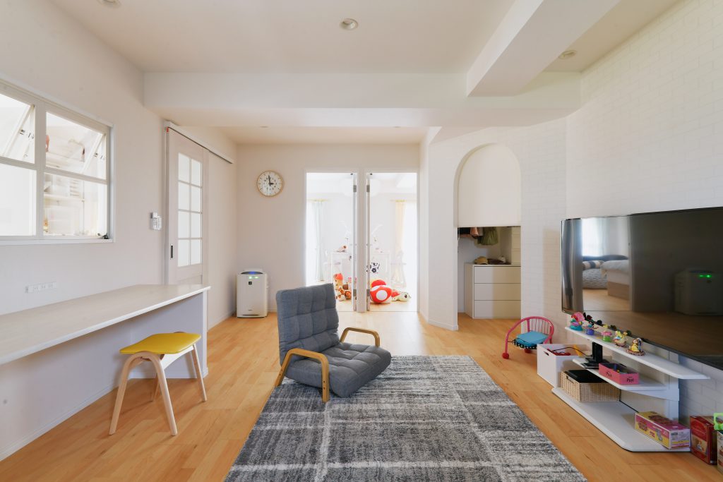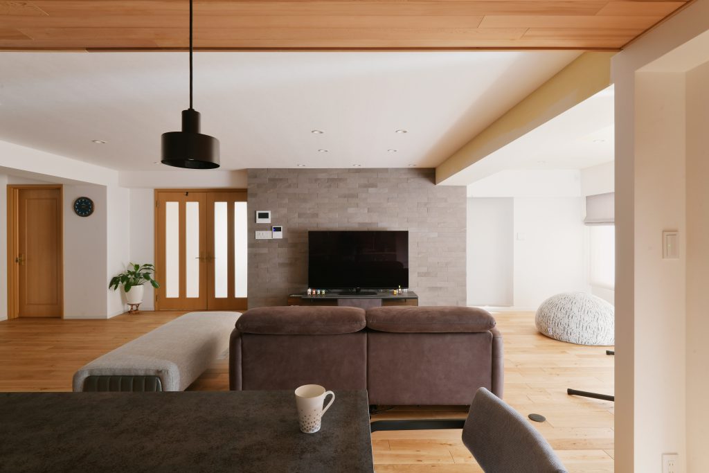 1Fのリビングはもともと30畳以上あり広い空間でしたが、和室区画があったり、造り付けのテーブルが配置されていたことで、テレビ前にゆったり座れるソファーを配置することができないことも悩みの一つでした。