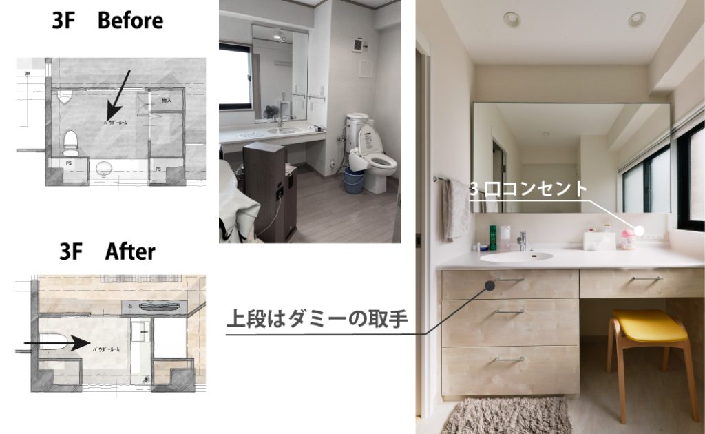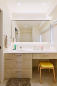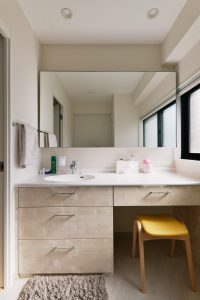 造作の化粧台は間口が1.3mとゆとりのある設計に。2人並んでも使いやすいように、ヘアアイロンも数種類繋げられるように3口コンセントにしています。洗面ボウルの下の3段引出しの上段は引き出しのスペースが無いため塞いでいるだけですが、取手を付けることでデザイン性にも考慮しています。