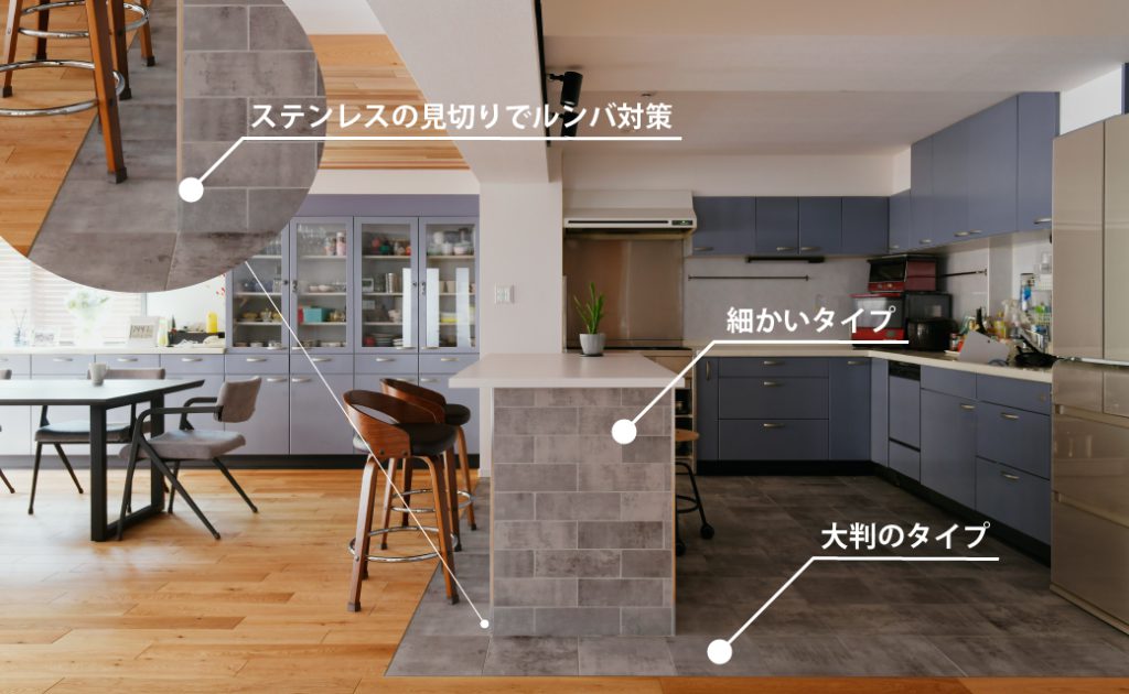 ディッシュアップカウンターは細部までこだわりました。キッチンの床とカウンター下のタイルはLIXIL製の同じ柄のサイズ違いの商品を使っています。また、カウンター下はお掃除ロボットがぶつかってもタイルが欠けないようにステンレスの見切りを入れています。
