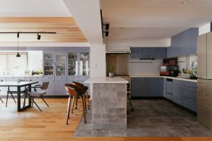 和室区画をリビング空間へ取り込み、造り付けの対面カウンターを作り直しました。上等なキッチンはそのままに活かし、内装を一新しています。