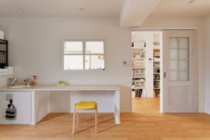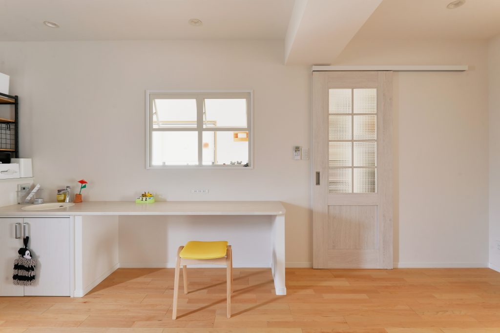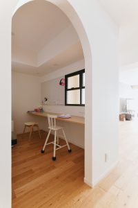 キッチンに立っていても視界に入る位置に勉強スペースが欲しい。奥様も一緒に並んで使えるようにしたい。