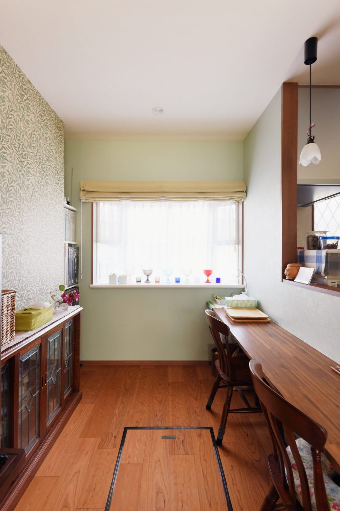 大切にされてきたお手持ちの家具達を生かせるように、T様と一緒に悩んだ内装。柄を使いながらも、落ち着いた雰囲気になりました。段差がなくなり広くなったサンルームでご主人様がゆっくりとおくつろぎ頂いていると伺い、とてもうれしかったです。仕様決めの際にウィリアムモリスの柄について奥様とお話しながら過ごした時間が楽しく良い思い出になりました。好きなもの・柄に囲まれてこれからもご家族楽しくお過ごし下さい!