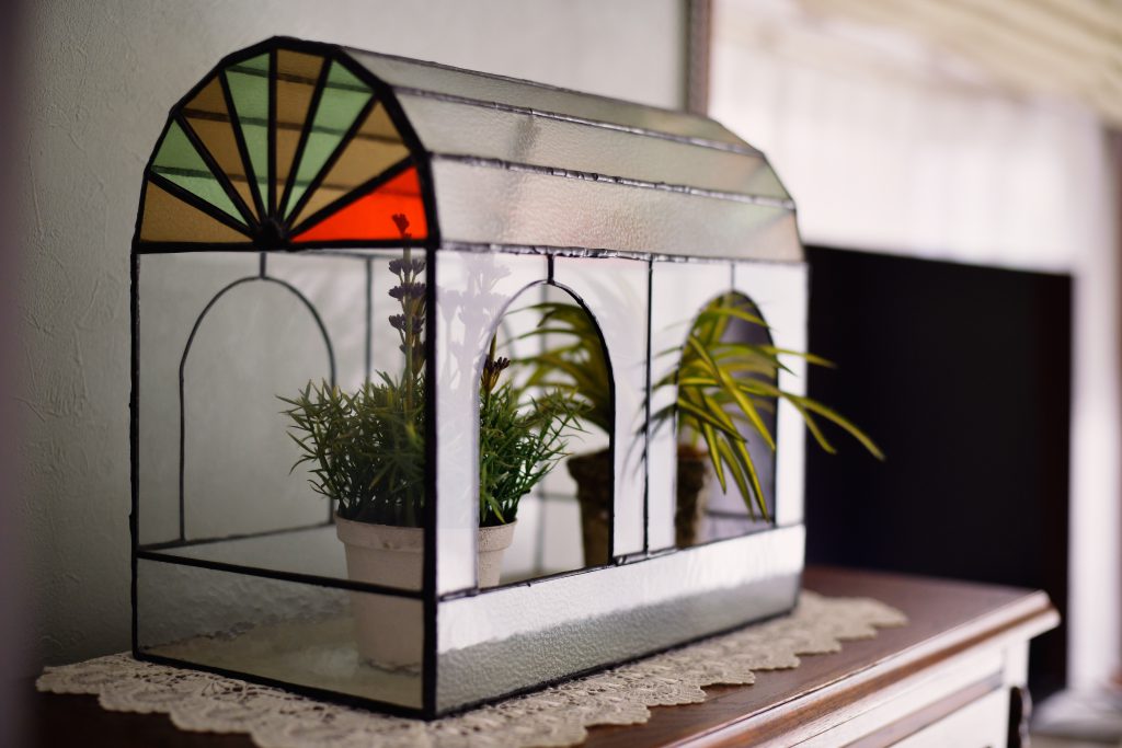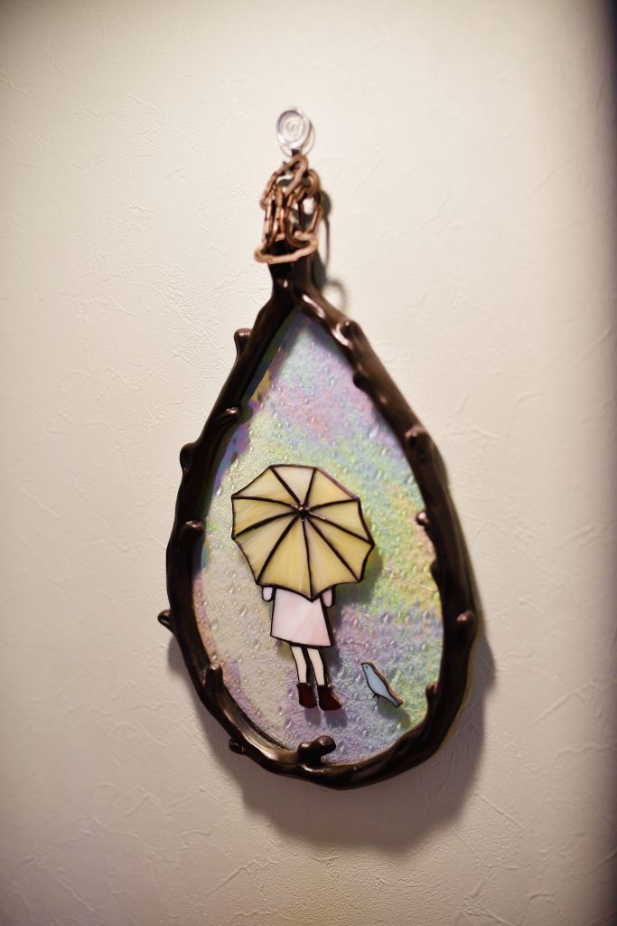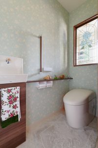もともと玄関の横にあったトイレは土間続きのシューズクロークになり、移設したトイレには窓がありませんでしたが、玄関の明かりを取り込めるように素敵なステンドグラスをはめ込みました。