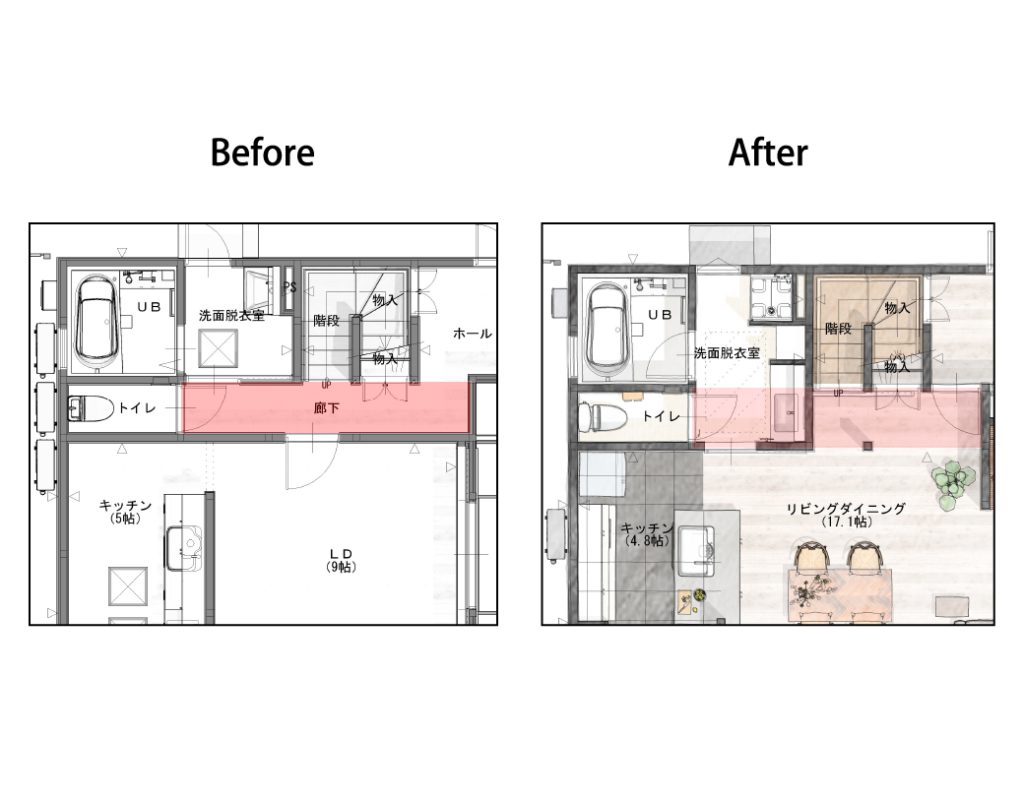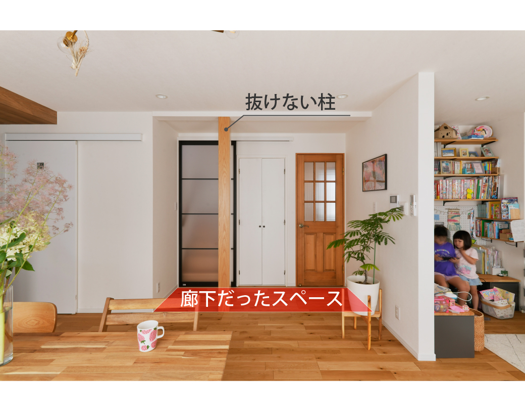 廊下を無くしたことで、広々としたLDKが実現しました。廊下とリビングの境界にあった壁の中には、家を支える大切な柱があったため、正面に柱を残す形となりました。