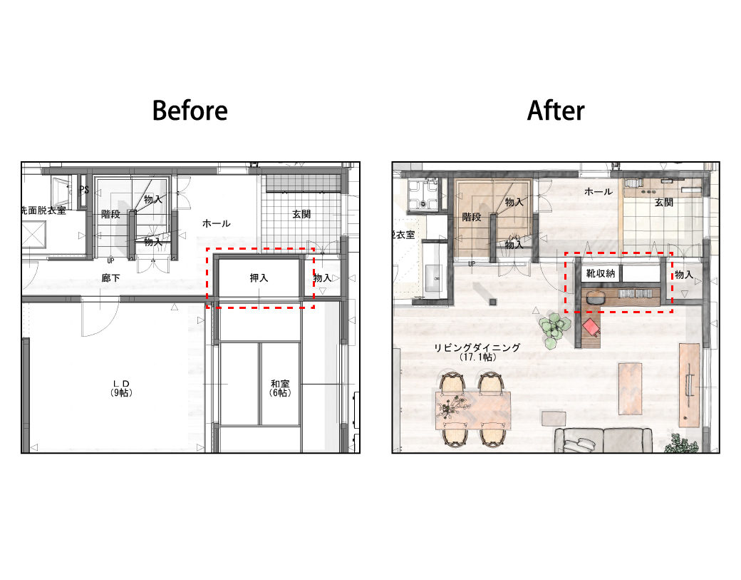 奥行のある押入れは玄関とリビングの両方向からアクセスできるように2分割しました。