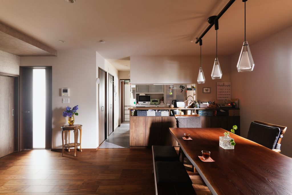 建築時に、リビングを広く取るために柱を立てずに大スパンで空間をつくったため、2階の床が傾いて来てしまっていました。補強のため1階に柱や梁補強をしつつ、間取りや動線に無理のないように、補強プランをたて、インテリアにもなじむように工夫しました。