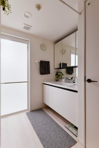 廊下を洗面室に取り込むことで、広さを確保し、キッチンから直接アクセスできるように間取りを変更しました。