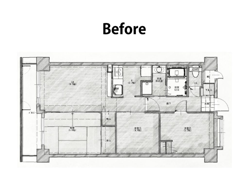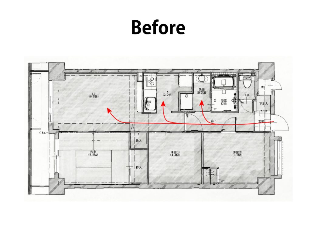 もともとは、玄関からそれぞれの水廻りへのアクセスが独立しておりました。