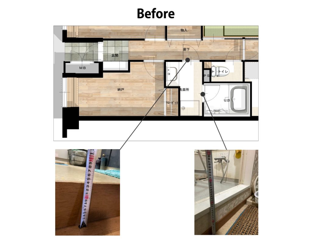 もともとは洗面室への入口と浴室の入口と2ヶ所大きな段差がある間取りでした。