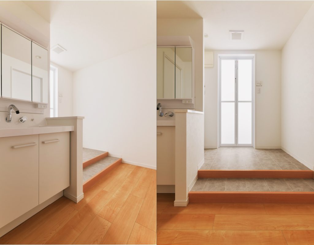洗面室の入口の位置を見直し、洗面室内で段差を2段つける方法を取りました。