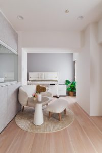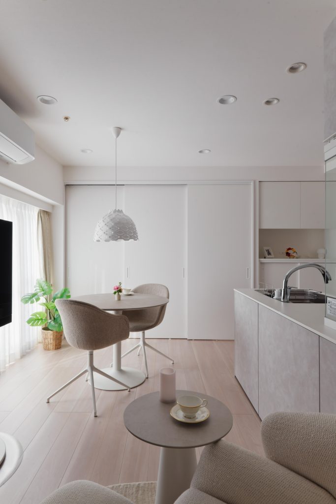 全体の色味はホワイト・グレー・ベージュ(グレージュ)で統一し、洗練された統一感のある空間に。各所にエコカラットのアクセントウォールを設け、大人の上質な雰囲気を演出しながらも、寝室のアクセントクロスで可愛らしさもプラスしました。