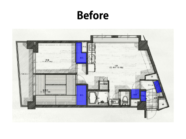 60m2前後のマンションで特に悩まれる方が多いのは「収納をいかに設けるか」という点です。