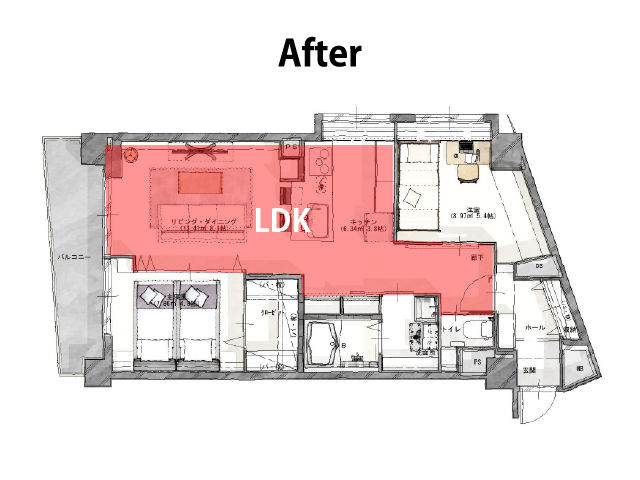 LDKに面する窓を境に、キッチンと洋室を隔てる壁を作ることで、窓を潰すことなく間取り変更を実現しています。