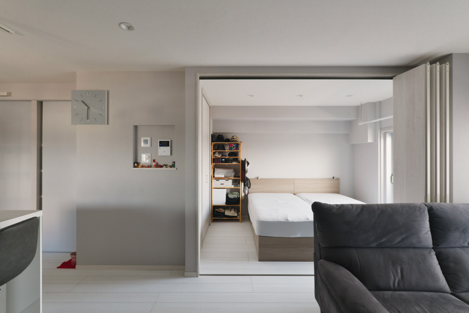 2LDKの間取り構成は変えることなく、限られた空間でLDKを広く確保するために、リビング空間をバルコニー側へ配置を変え、対面キッチンも実現しました。