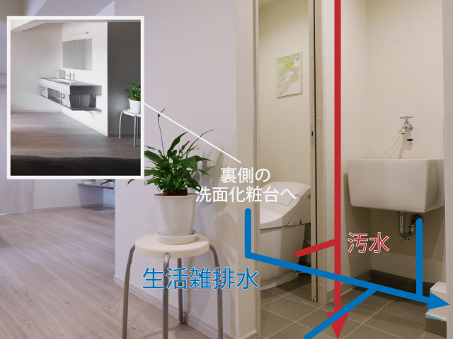 トイレの汚水の配管の下をクロスするように洗面台の排水を潜らせて、浴室の排水と合流するようにしています。