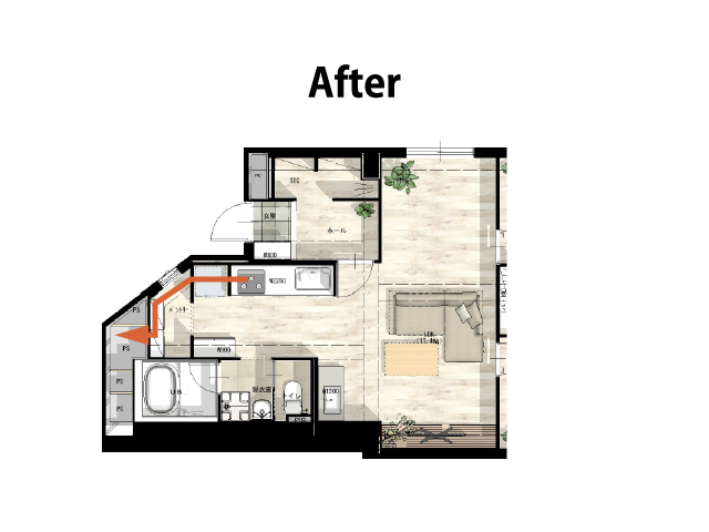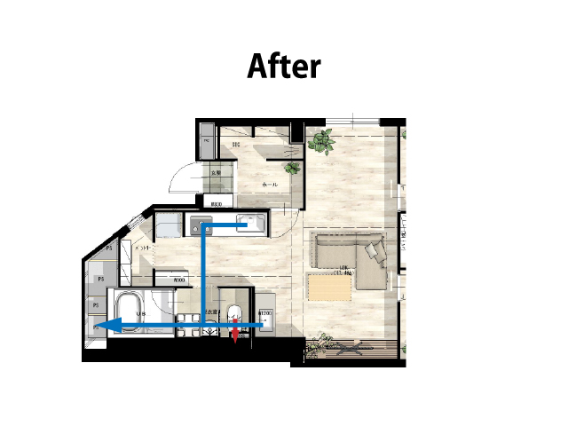 洗面台をリビングに移動したため、排水の経路を確保するためには工夫が必要でした。