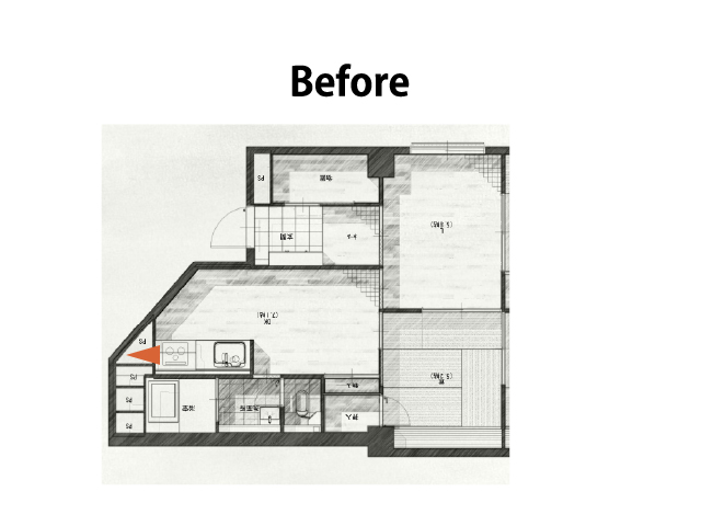 リビングと一体感のあるキッチンを実現するために、キッチンを反対側の壁に移動しています。