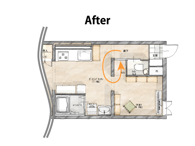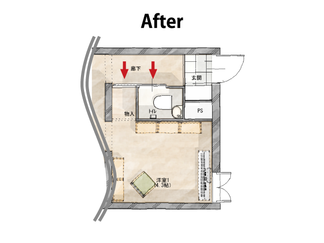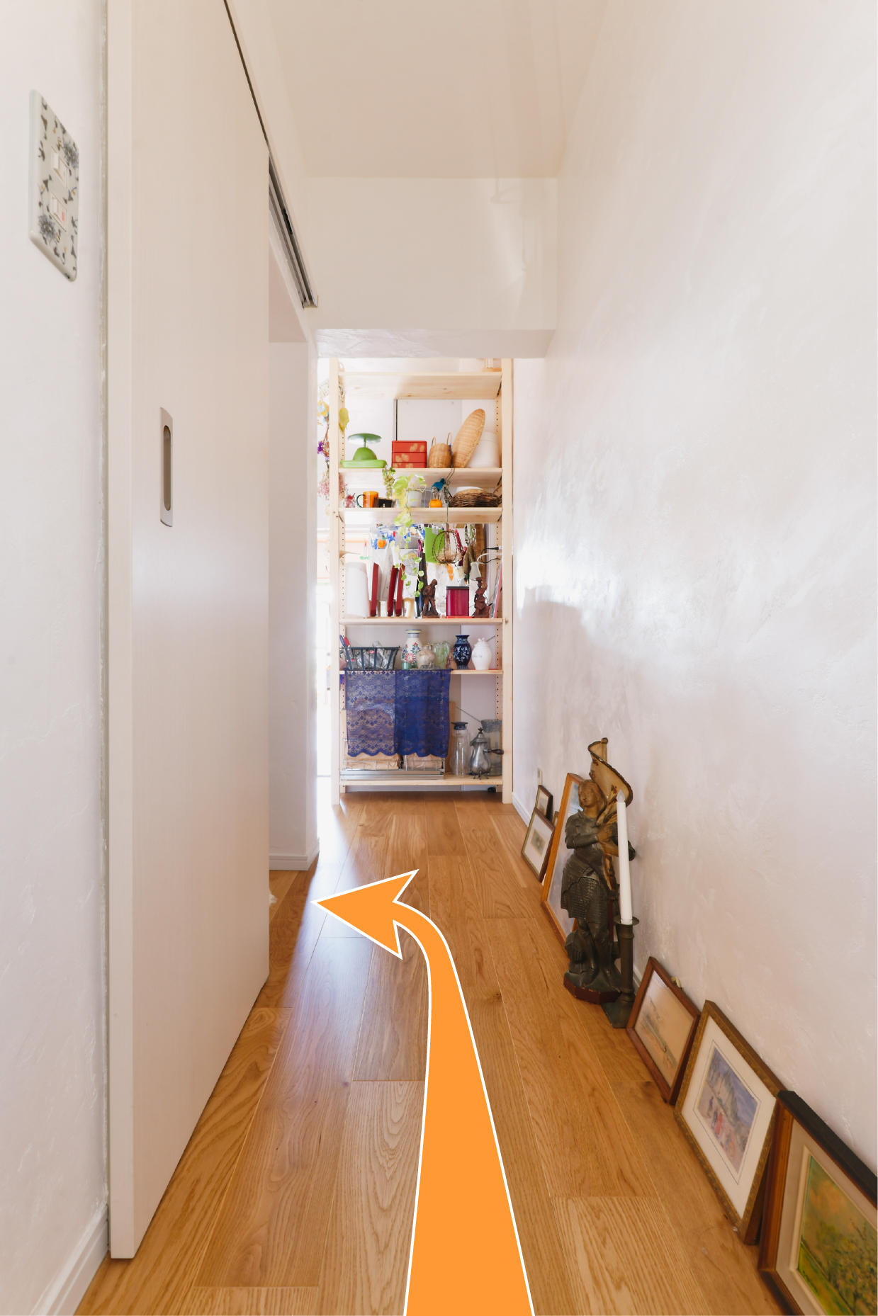物入の床を繋げたことで収納・通路になり回遊ができるようになりました。
