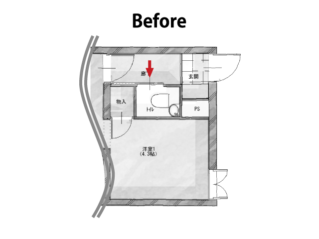 リフォーム前はトイレ横の物入れ空間は反対側の部屋からのみアクセスできる間取りでした。
