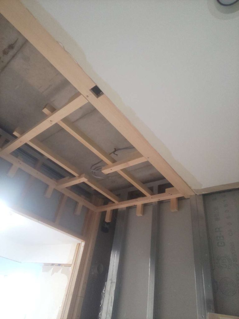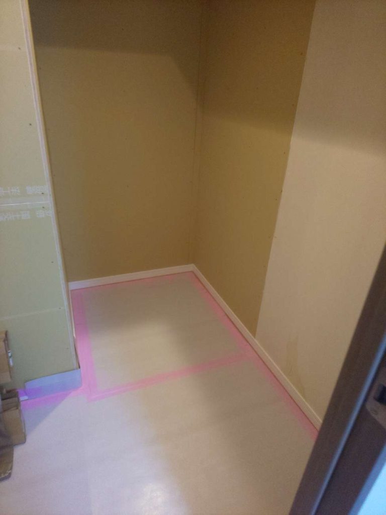 石膏ボードを貼って、クロスを貼り、収納棚や照明を設置して完成です。