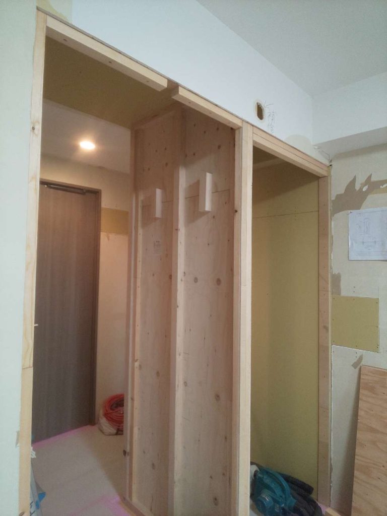 寝室側、子供部屋側それぞれに半分ずつスペースを分けるために間仕切り壁を立てます。