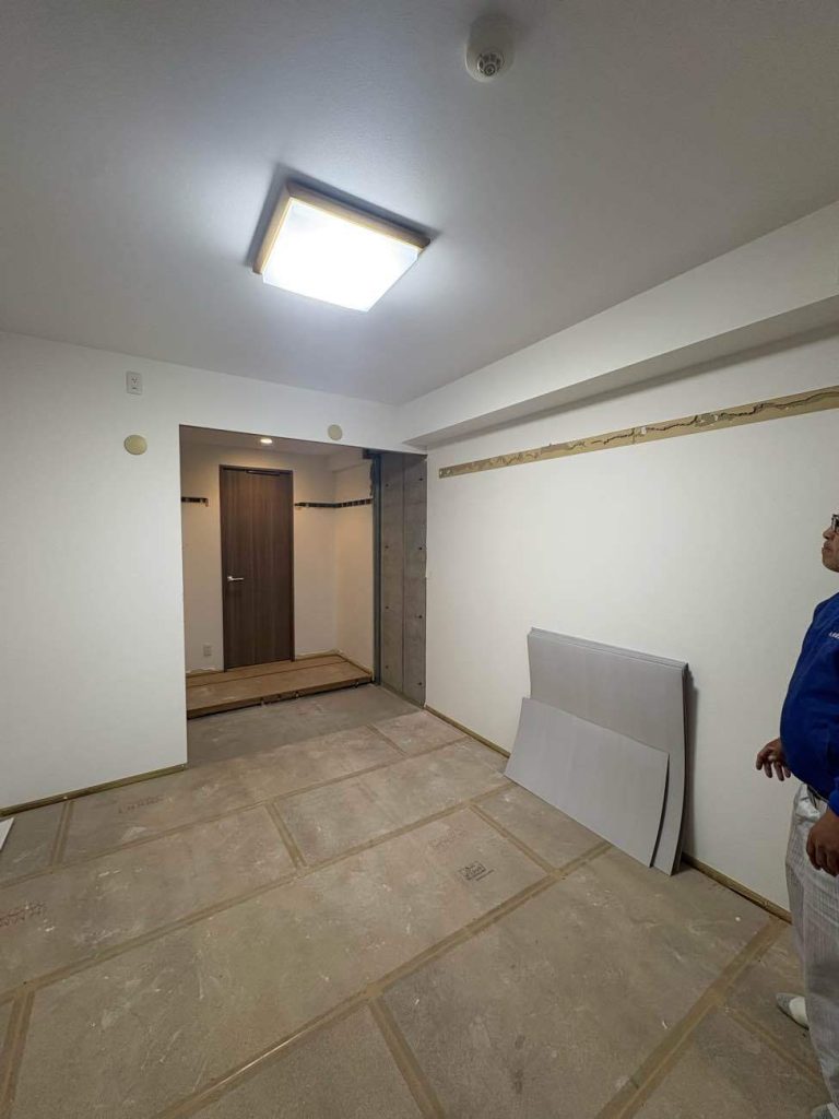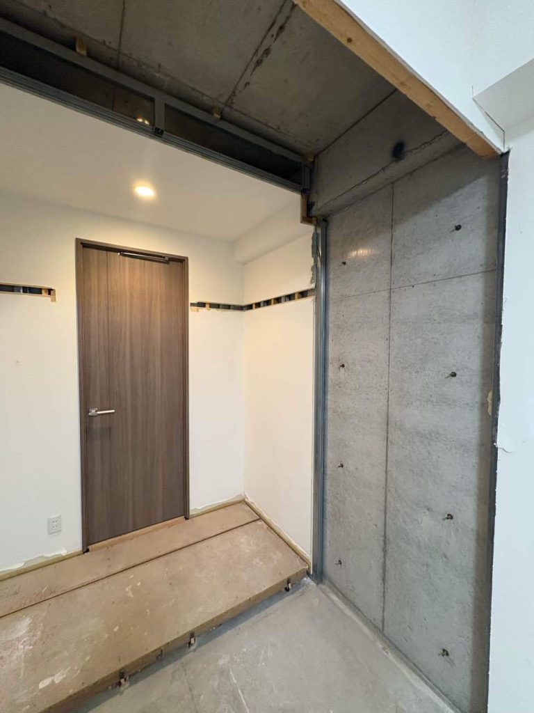 和室側から見た写真。奥の寝室のクローゼットの床下地のパーチクルボードが見えています。コンクリートの壁の空間が和室の押し入れの空間で、奥の扉は寝室のクローゼットの扉です。2部屋がつながっている状態です。