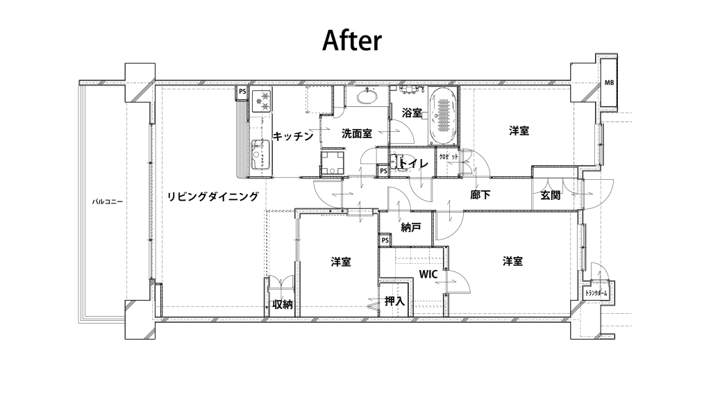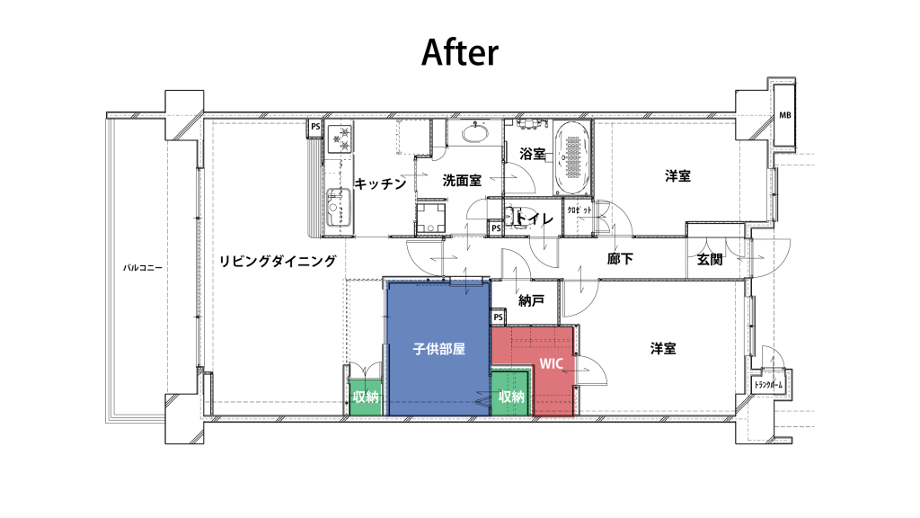 和室→洋室、収納内部造作、照明位置変更、フローリング貼り、室内窓設置、収納建具&子供部屋入口建具新設、クロス貼り