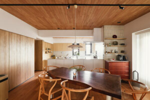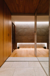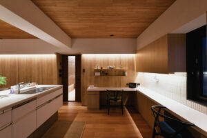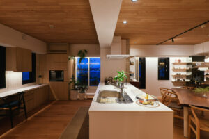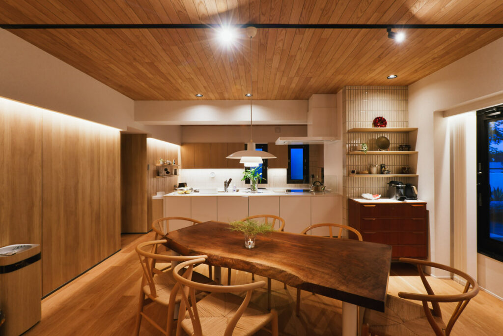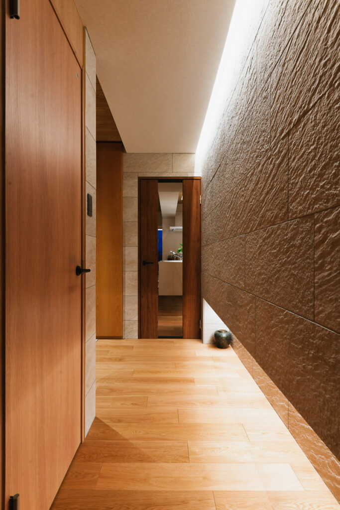 オークの明るい木目を基調に、ベージュトーンのタイルやストーン材で温もりを、ブラックのアクセントで大人な空気感を演出しました。空間のノイズを徹底的に削ぎ落とした「ノイズレスデザイン」と、光が滝のように流れる美しいライティングプランにご注目ください。