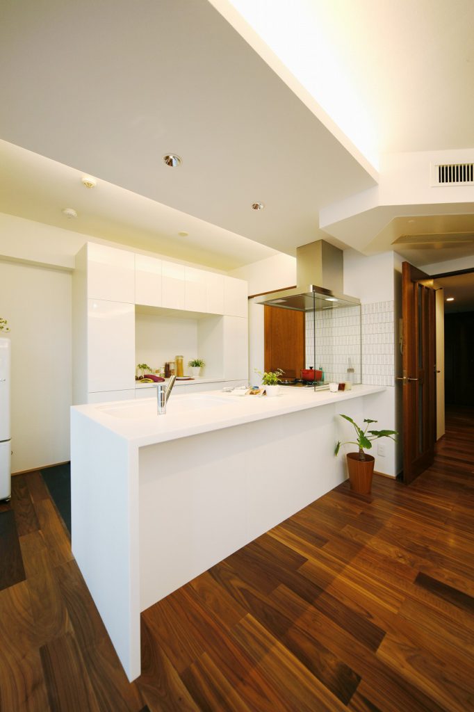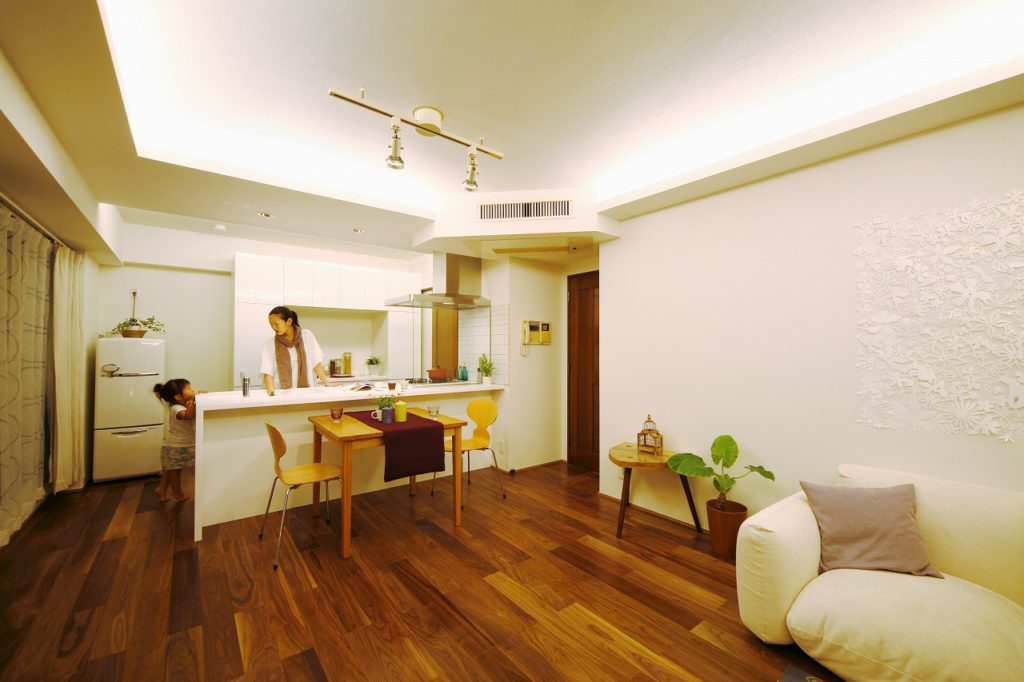 築12年のマンションを購入し、LDKの開放性を高めること、上質感のある厚突のウォルナットの床材とクチーナ社のキッチンを使い、自分達の好みの空間にしたいというご要望で今回のリフォームになりました。