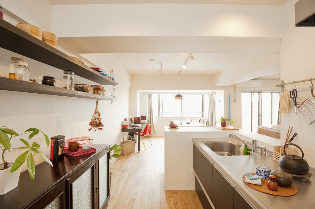 施主様のご予算をオーバーしないよう、O様の希望に優先順位をつけてご提案しました。まず、2部屋を一体化し広くしたLDKと、それに続く廊下には贅沢に無垢材を採用。壁付きのキッチンを、給排水管を大幅に付け替えない範囲で移動し、念願の対面式に。一方で、建具などは既存のものを活用してコストを抑えました。