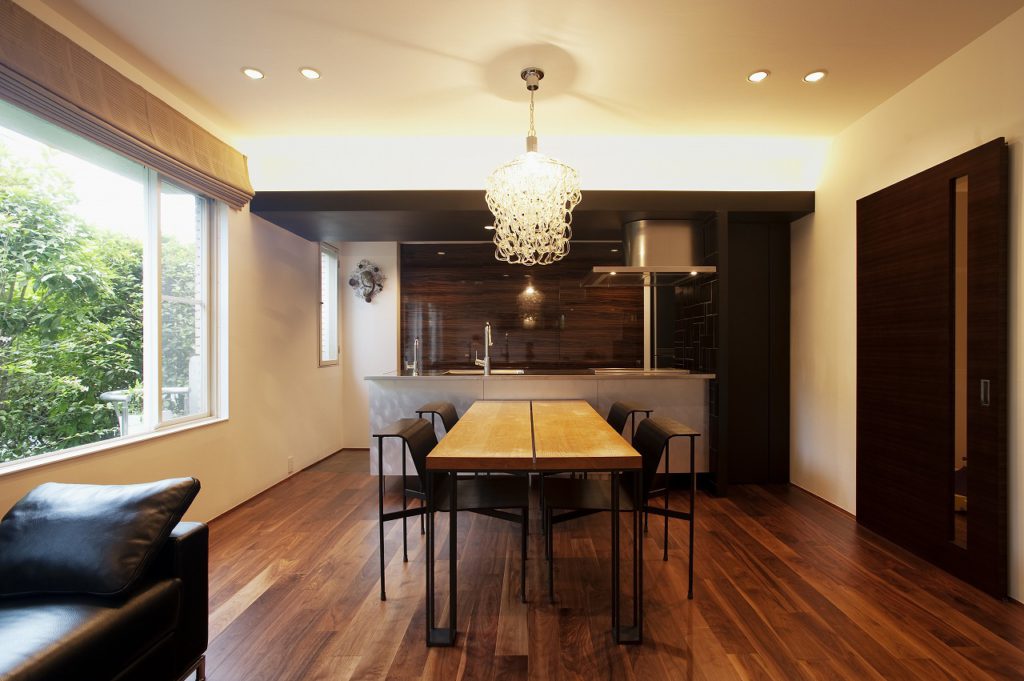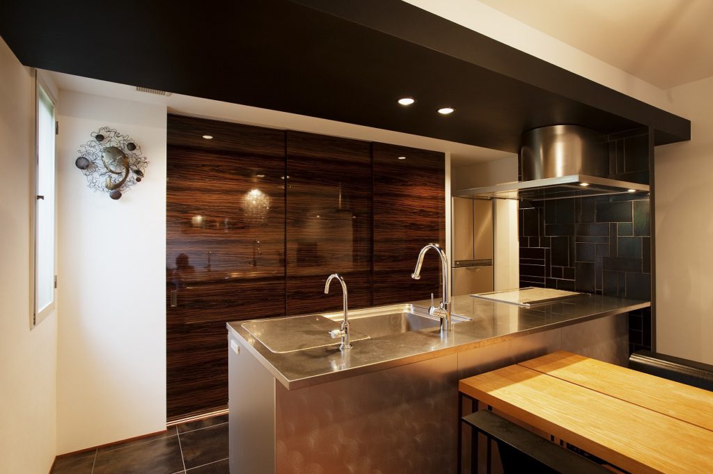 キッチンをオープンにし、そこに存在感のあるTOYOキッチンを設置しました。壁面収納には華やかな木目柄をセレクト。キッチンの横壁や梁にマットな質感の黒を入れることで、ナチュラルでありながらシックな空間に仕上げました。