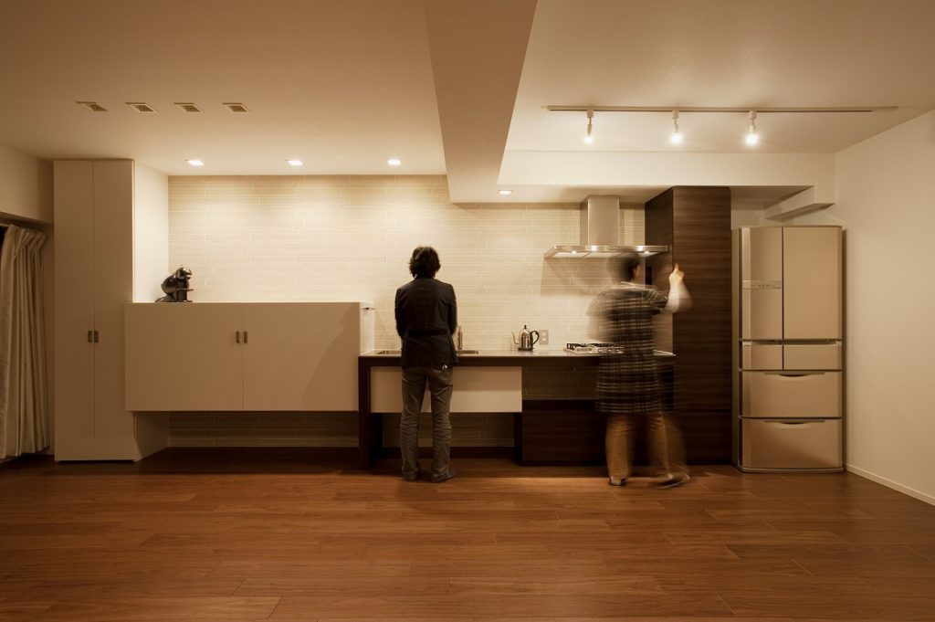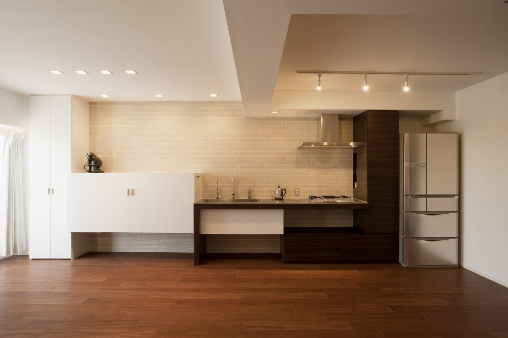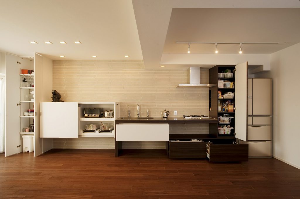 「キッチンを中心に家族がどこにいるか、ひと目でわかるよう広いLDKが欲しい」というご要望に応えるため、和室とLDKを一体化しました。そこに壁一面を使ったキッチンを造作しました。家電や食器を隠す収納を設けたほか、見た目が重くならないように横のラインを強調したすっきりとしたデザインに仕上げました。