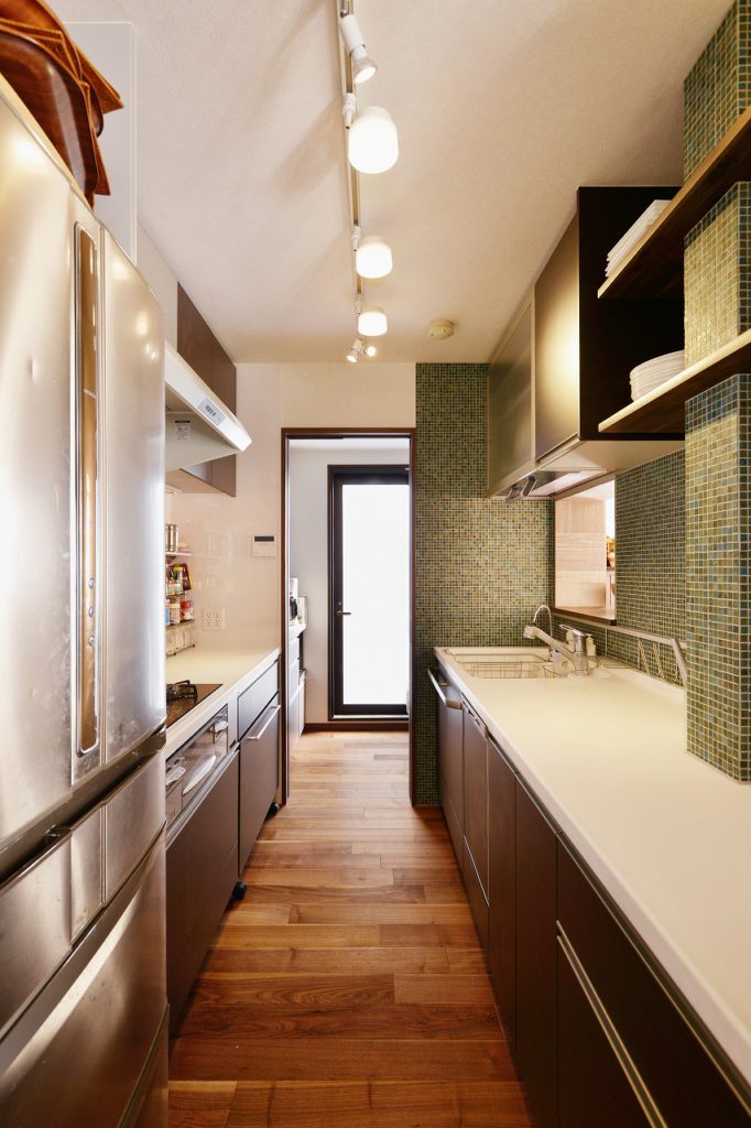 キッチンの位置を移動した間取りの変更を含めたリフォームを希望されていたが、壁式RC造のため既存壁を動かす事がほとんどの箇所でできませんでした。制約のある条件の中で、キッチンを2列型にしてご夫婦で使いやすい配置にしたり、LDK横の生かしきれてなかった和室をダイニングスペースに変えるなどで、広々としたリビングを実現できました。足場板などの古材をデザインに組み込むなど、素敵な空間となりました。