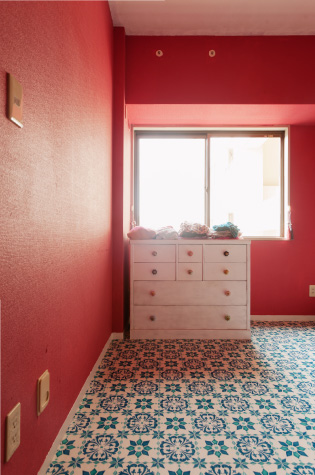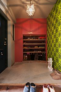 天井もコンクリート現しとして、冷たい質感と足場板など温かみのある素材とのコントラストとしています。キッチンで使われているタイルはイメージカラーを聞きながら組み合わせや色の割合を決めていったオリジナルの色合いになっています。壁紙もベースの部分でも多色使いとしていて、柄物のクロスはご自身でご手配いただいたこだわりのものです。トイレのクロスはヴィンテージもののクロスをつかっています。洗面台もオリジナルで造作。
