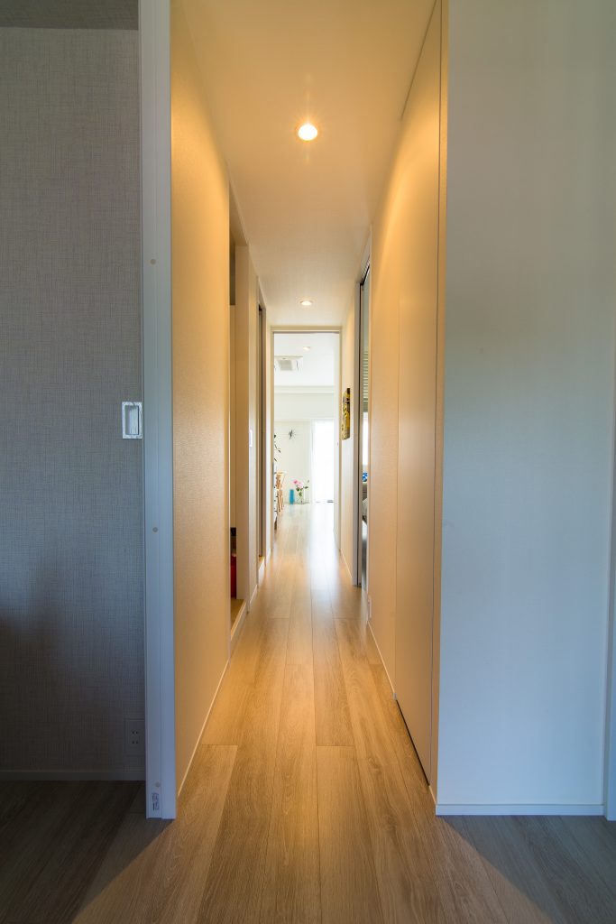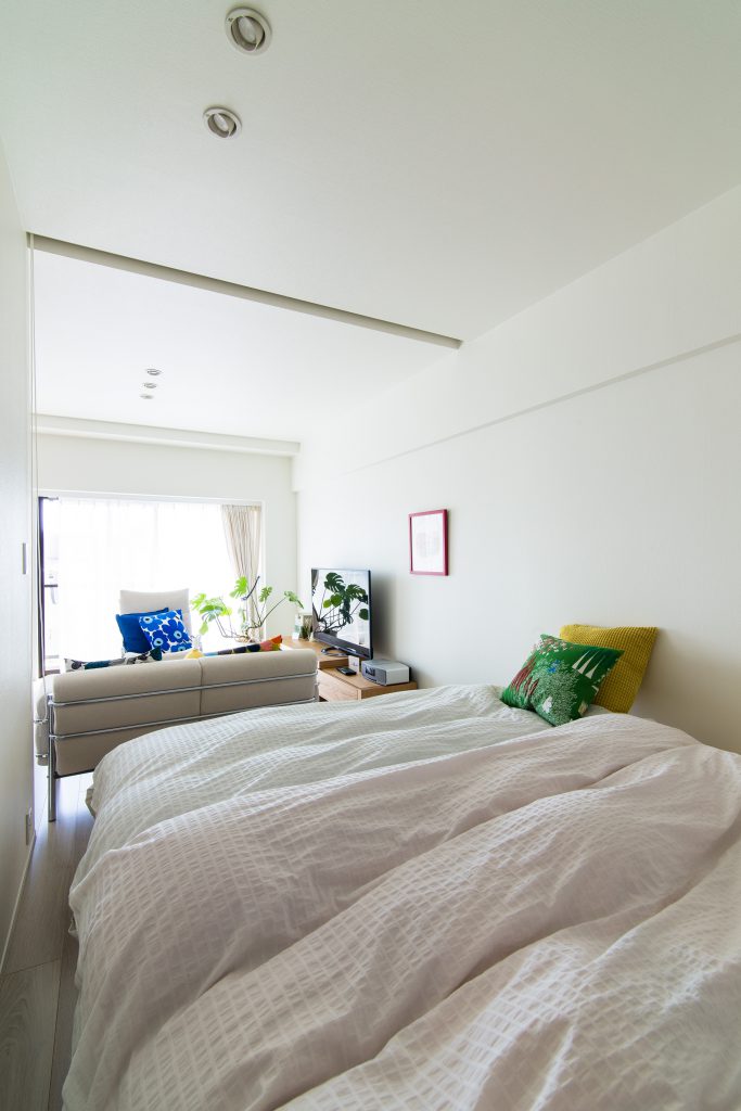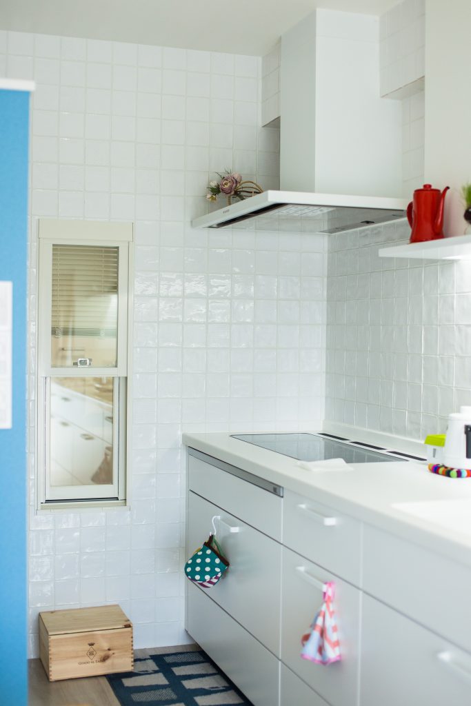 プランに際しては、各室の「空間のつながり」をポイントとしました。天井高に合わせた建具やブラインドを開ければ、空間が全てつながり、風や光、家族の存在を各部屋に届けます。南側に配置したLDKは、白基調の内装とサッシ2つ分の開口から光が差し込み、広々とした明るい空間になりました。思い切って4mにしたキッチンは、LDの収納の役割を担いつつアクセントや家具と調和し空間のポイントとなりました。