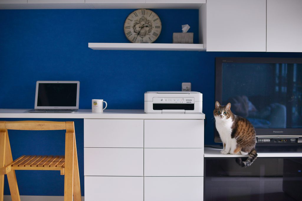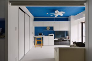 ご自宅でお仕事、家事と忙しく家で過ごす時間が長い奥様。お仕事関係の来客もある中、現状はキッチン・ダイニング・お仕事スペースの区切りがなく、動線や家具家電の置き場、収納不足に悩んでいるスペースを、過ごしやすくしていきたい。特にキッチンは家具家電の置き場が無く、生活感が丸見えなのが気になっている…。インテリアは青や白で統一して海にいるような開放的な空間にしたい。