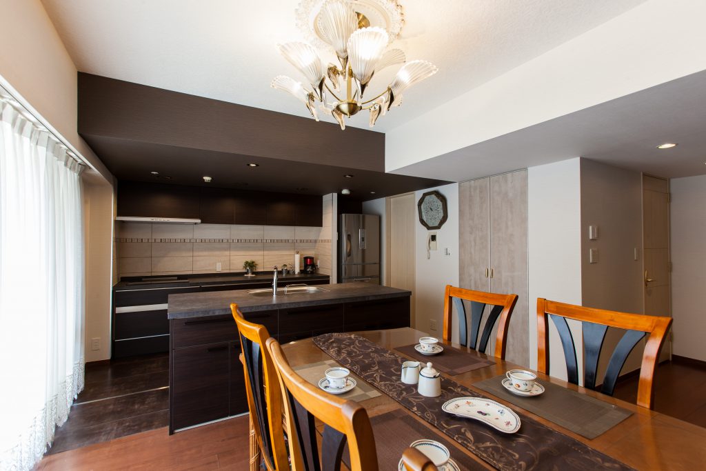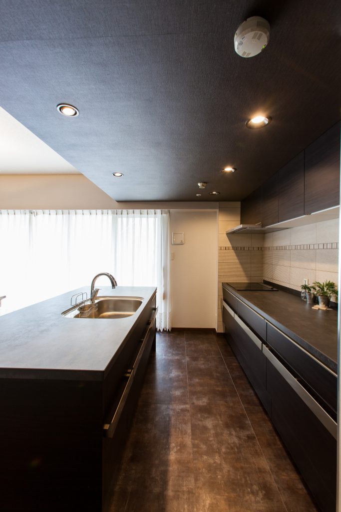 マンションのためキッチンの天井が低く、あえて圧迫感を出すことでダイニングの天井の高さをアピールしました