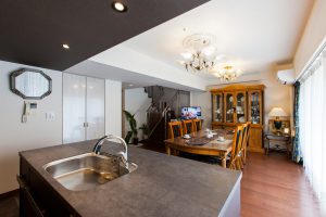 キッチンを何にするか色々迷いましたが、セラミック天板のリシェルを採用。タイルとも相性がよかったです。お手持ちの家具がすてきなので普通のマンションの内装ではつまらないため床も天井もアレンジしました