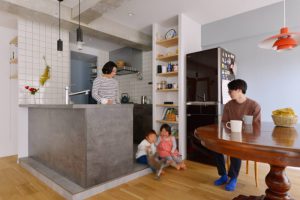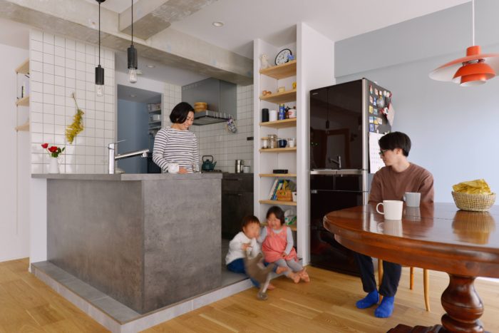 「ここに良く座るんです」工事後に久しぶりにお伺いさせて頂きました際に教えて頂いた事です。こことは配管の為に一段高くしたキッチンの床の段差部分にお嬢さんとご子息が並んで座ってお菓子を食べているところでした。お話して頂いた以外にも普段は見えないけど家族が明けた時にテンションが上がる収納のお気に入り色の塗装。ダイニングテーブルで集まったり、ソファ廻りで遊んだり、陽の光もよく入り風通しの良い明るいLDKには色んな居場所があって過ごし方がある。朗らかなN様ご家族らしいお家が出来上がったかと思います。最後まで細部にこだわりぬいたのはこんな時間を過ごされたいからかと思います。そんな思いにご助力させて頂いた時間はとても楽しかったです。今後とも何かございましたら呼んでいただけますと嬉しいです。ありがとうございました。