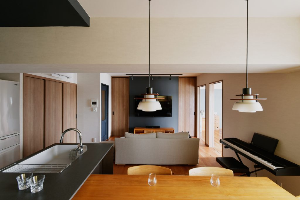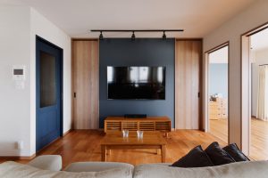 ウォールナット系の床材・建具と、紺や青といったアクセントの組み合わせが印象的なご自宅になりました。